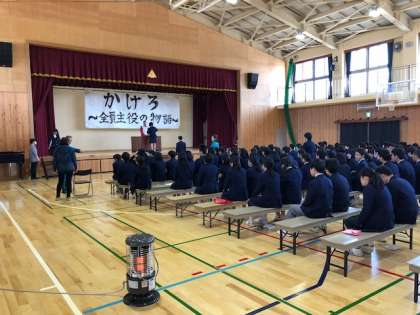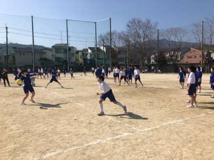 午後からは,体育委員が企画した運動会がありました。初めに,1年生の時のクラスで大縄跳びを行いました。懐かしいメンバーにみんな喜んでいました。次は,2年生の時のクラスで全員リレーです。運動不足の生徒も多く,怪我をしないか冷や冷やしたリレーでした。最後は,今のクラスでドッヂビー,ドッヂボールをしました。受験でお疲れの3年生,久しぶりにみんなで楽しんで,リフレッシュできたのではないでしょうか。