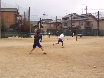 小雨まじりの中、ソフトテニス部が練習をしています。本校では、専用のテニスコートもあり、環境は恵まれています。
