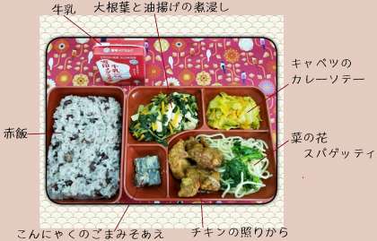 今日は「入学祝いmenu」ということで,「赤飯」が登場しました。また,中学生に人気の,「チキンの照りから」や,旬の菜の花を使った「菜の花スパゲッティ」,カルシウムたっぷりの大根葉を使った「大根葉と油揚げの煮浸し」,カレー風味でおいしい「キャベツのカレーソテー」「こんにゃくのごまみそあえ」といった献立です。