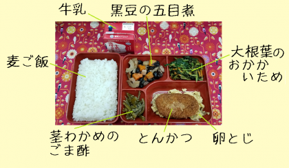 今日のメインはとんかつでした。このとんかつと卵とじをご飯にのせ,天つゆをかけたら「かつ玉丼」の出来上がりです。とんかつは冷めてはいましたが,肉は軟らかく,てんつゆがかかると美味しくなってご飯もすすみました。
