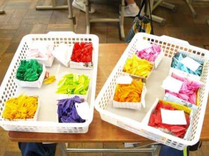 それと並行して,平和を願う千羽鶴の作成も行いました。1つ1つ思いを込めて,丁寧に折っています。