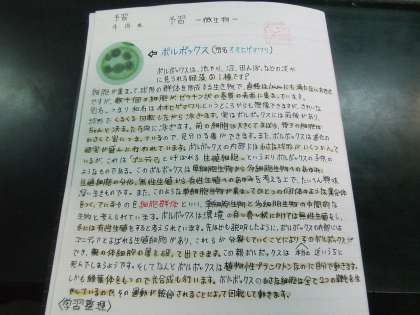 本時のめあては、「微生物の観察を通して顕微鏡の使い方を学ぶ」です。倍率を決めて焦点を合わせながら観察をします。教科書にでているような、ゾウリムシやアオミドロをはじめ、見つけにくいボルボックスも捉えることができました。小さな球体の中にも生命が宿り、芸術的な美しさです。