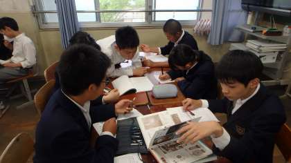 本日4限に平和学習をしました。以前の平和学習で行ったマッピングから,各クラス・班ごとに取り上げる題材を決めて,本や資料を沢山用いて調べ,まとめて来ました。