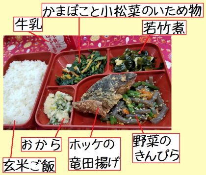 今日の給食は,ホッケの竜田揚げでした。生姜,醤油,料理酒で味付けがされていて,からりと揚げてあり,とても美味しくいただきました。京都府産のたけのこを使った若竹煮は,季節を感じさせていただける地産地消の献立です。