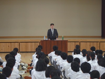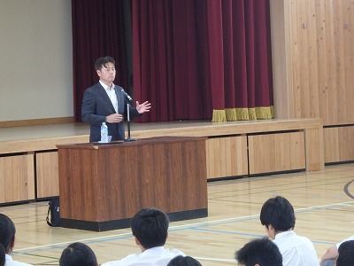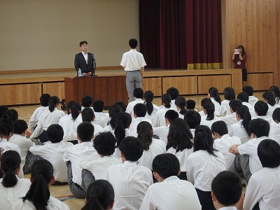 2年生は、チャレンジ体験に向けて、嵐山商店街副会長を務めておられる「いしかわ竹乃店」の石川さんにご来校いただき、「仕事」をキーワードに講演をしていただきました。講演では、石川さんご自身の経験談も交え、働くことの意味やチャレンジ体験学習に臨むにあたっての心構えなどをお話しいただき、とても多くのことを学習しました。その中では、嵐山商店街のユルキャラ「月橋渡」誕生の裏話や、新商品開発の面白さなど、興味深いお話もたくさんしていただき、また、講演後の質問コーナーでは様々な質問も出され、「仕事」に対する色々なことを考えた、大変意義深い時間となりました。定期テスト後の5月29日(火)から6月1日(金)までの4日間、地域の事業所の皆さんにお世話になり、実際に仕事に取り組むという大きな体験学習がいよいよ間近に迫っています。