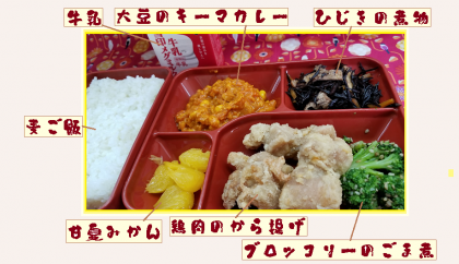 昨日の給食&食育放送です。子どもも大好きなから揚げです。鶏肉やキーマカレーの大豆に含まれるたんぱく質と,ブロッコリーや甘夏のビタミンCの組み合わせの凄さ,放送で紹介しています.