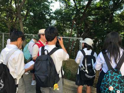 当時のままの校舎の壁、皮一枚で生き残ったカラスザンショウの木、当時の様子に触れ、学びを深めています。雲ひとつなく、厳しい日差しの中でも真剣な眼差しは変わりません。