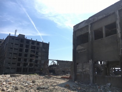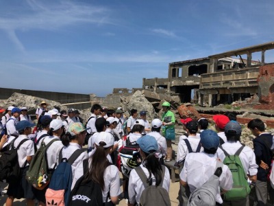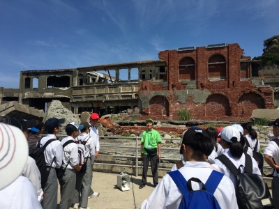 軍艦島に無事上陸し、ガイドさんの案内を聞いています。