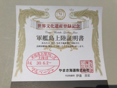 無事に長崎港に帰ってきました。帰りのフェリーから降りると,軍艦島上陸証明書を頂くことができました!
