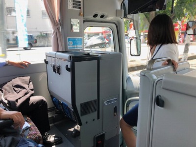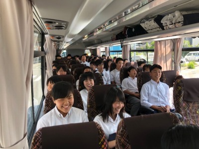 バスの旅の最後は「社歌」と「校歌」の交換です。