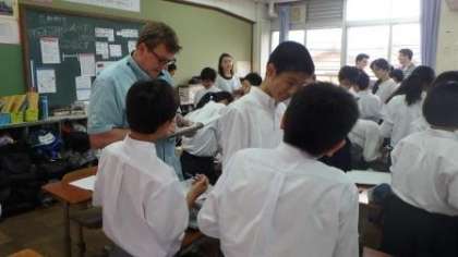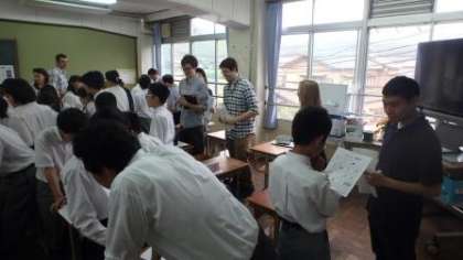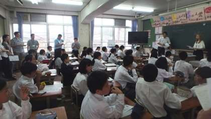 他校から多くのALTが来校して下さり,生徒たちもいつもより更に頑張ろうと積極的に授業に参加していました。最後には,Do you〜?を用いて相手に質問するワークで,生徒同士話したり,ALTに質問したり,学んだことを活用して取り組めていました。