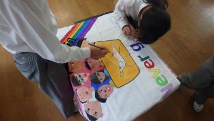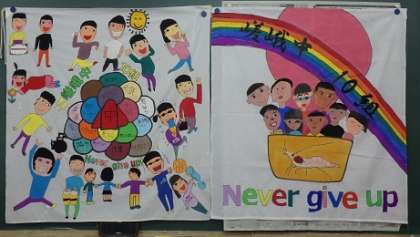 イメージやデザインから自分たちで話し合って作りました。自分の顔は自分で、文字などもみんなで分担して描き上げました。合同球技大会など、合同行事の時には持って行く予定です。