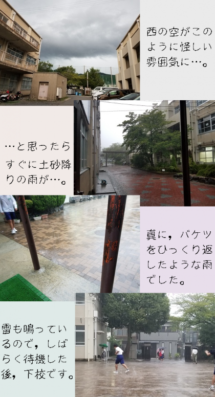 昼間は晴間も見えて,朝の雨が嘘のようでしたが,放課後部活動をしているときに,西の空が怪しくなり,下校時刻を早めて早く帰らせよう,と声をかけたら,いっきに大雨が降ってきました。雷光も認められたので,しばらく学校に待機の指示を出したあと,タイミングを見て下校を促しました。