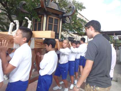 予想以上の重量に,担ぎ手の3年生たちからは思わずうめき声が上がります。それでも,懸命に声を上げて神輿を揺らす姿を見ていると,本番を待ち遠しく思います!