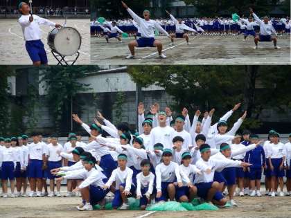 応援合戦の様子です。この日のために,2ヶ月以上取り組んできました。夏休みはもちろんのこと,夏休みがあけてからは,昼休みの練習を毎日続けてきました。各クラスの応援団のメンバーは,自分のクラスの生徒に動きを伝え,指示を出し,よりよいものを目指して頑張ってきました。上へ,上へ,前へ,前へ,の気持ちで,少しでも良い物を,と頑張ってきました。嵯峨中学校伝統の応援合戦は,最盛期と比べると規模は小さくなっているかもしれませんが,代々の先輩方の心を受け継ぎ,今年も精一杯やれたと胸をはって言えると思います。昨日までに,団ごとの演技を見ることもありましたが,どの団も,今日のパフォーマンスが最高でした!!