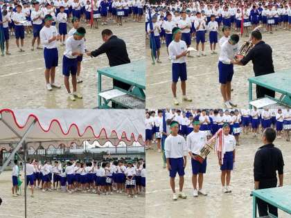 校長先生のお話のあと,総合優勝・応援優勝の発表と表彰,各学年団体種目3位までの表彰がありました。総合優勝は緑組!そして応援優勝も緑組でした!大歓声がおこっていました!写真を見ていただいたらわかるように,閉会式に臨む生徒達の足下はぬかるんだまま。でも,そういうグラウンド状態のまま体育大会がすすんでいたことを,思わず忘れるくらい,生徒達の表情は本当に生き生きとしていたのです。