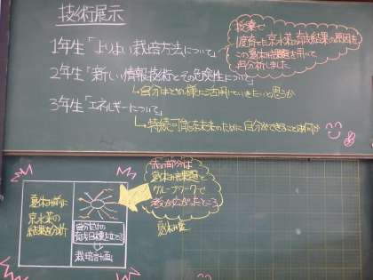 嵯峨中フェスタ 技術科の展示です。技術に関する知識の活用や,環境・経済・社会的側面などからものづくりについて考えました。