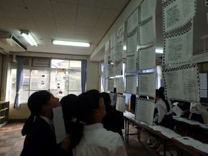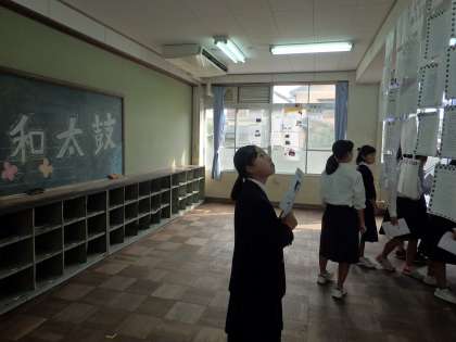 和太鼓連による展示です。和楽器や伝統芸能についてのレポートや嵯峨中パレードの意気込み,感想を展示しています。