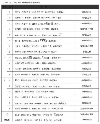 現在、嵯峨中パレードで3年生が制作した幟と横断幕を、地域の主要駅と嵐電四条大宮駅に展示しています。駅を利用する方々にも嵯峨中学校のESDの取り組みを知っていただくのがねらいです。展示期間は10月の末までの予定です。各クラスで考えてもらった標語の幟および横断幕は、以下の駅に展示されています。ご利用時は、是非ご鑑賞ください。