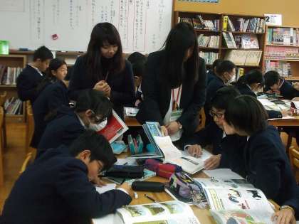 本時の目標は,「テーマに対する自分の考えを持ち,適切な情報を集めて整理することができる」です。場所は図書室で行い,テーマに沿った本を選び,熱心に取り組んでいました。