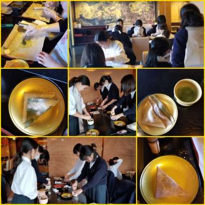 お店では「おいしい生八つ橋の作り方」という説明書もいただきました。そこには「八つ橋の歴史」が書かれていました。「箏」と「八橋検校」,「八つ橋」との関係が書かれていて,伝統文化部のみんなにとっては,京都の伝統的なお菓子,八つ橋の勉強にもなりました。これを機に,お菓子にもますます興味を持ってもらえたらと思います。