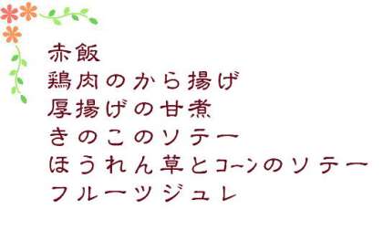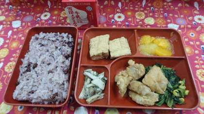 今日の給食は「入学祝いmenu」でした。入学をお祝いして赤飯が登場。そして人気の鶏肉のから揚げと手作りデザートのフルーツジュレが組み合わされていました。