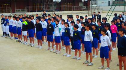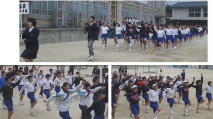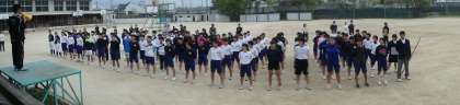 最初からしっかり声が出ていて,手もしっかり振り上げ,太股もしっかりあがっているではありませんか。指導にあたっていた,嵯峨中に来て5年目の体育の先生も,最初からこんなに出来ていたのはこれまでで一番だ,と評価したほどです。