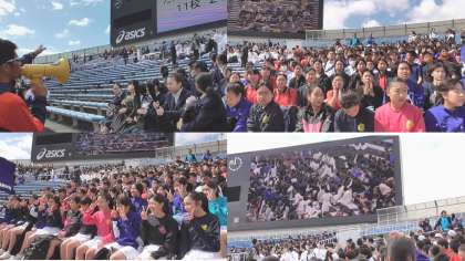 西京極陸上競技場までは阪急電車で移動しました。競技場につくと,早くに来ていた先生が嵯峨中学校のプラカードを掲げ,場所を示してくれました。
