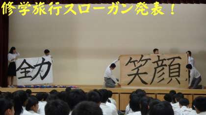 「全力」で取り組んだスローガン発表。大変良かったです!!このスローガンを忘れることなく,修学旅行の3日間を過ごしていきましょう!