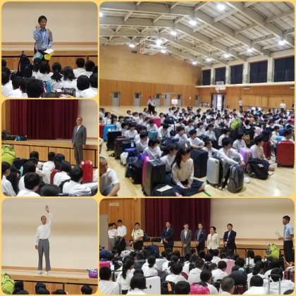 添乗員さんは博多から合流してくださる方を含めて合計6人。「みんな無事帰ってこれるよう頑張ります」と言ってくださいました。写真屋さんは,黄色い服を着ているので、見かけたら声をかけてください。」と言ってくださいました。そして,学年主任の先生が「しおりにすべて書かれている。自分でしっかり判断できる3日間に!」と締めくくって,出発式が終わりました。