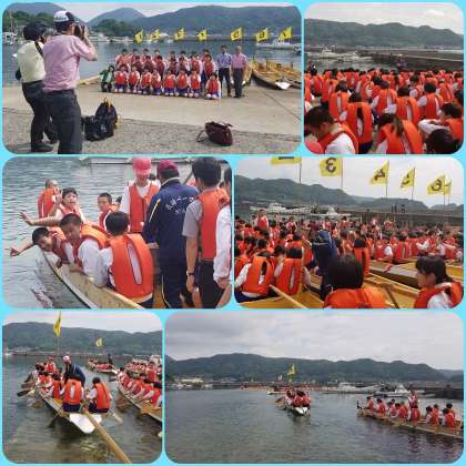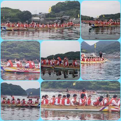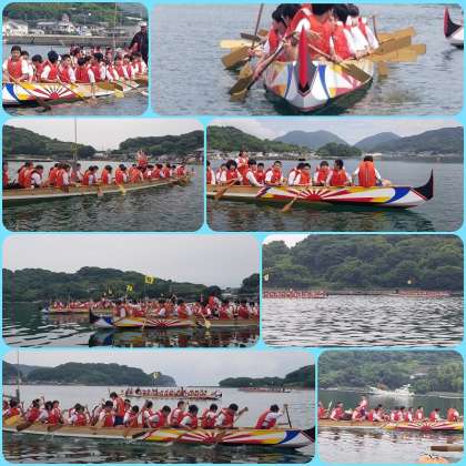 ライフジャケットをつけ、クラスごとに乗り込みました。クラスごとにかけ声をかけ、自分たちの力で進めます。3本レースを行いました。何と、3組が3回とも1番でした。やっぱり早く進むペーロンを見ていると、みんなのかけ声がそろっていて、櫂の扱いがとても力強かったです。