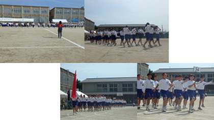 吹奏楽部のマーチングに続いて,選手入場です。どのクラスも,演奏に合わせ,元気に声を出して行進していました。