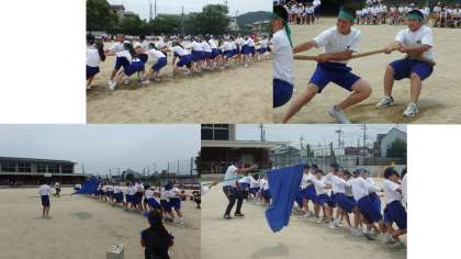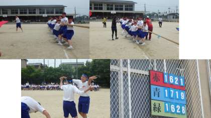 午前中最後の競技,綱引きです。最初は,緑,赤,青が総当たりで行い,青が勝ちました。勝った瞬間,青組団長はチームメンバーと両手でハイタッチしていました。おめでとう。