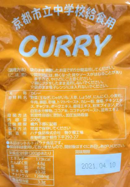 今日の給食はカレーでした。京都市の給食のカレーは,いろいろなことにこだわって作られています。まず,使われている肉は国産の牛肉です。輸入されている牛肉についても,基準を守られたものであるので,安全ですが,学校給食であるということから,万一の場合を考え,より安心・安全な給食を実施できるよう,国産の牛肉が使用されています。また,着色料・保存料といった添加物が入っておらず,使用している野菜についても,ほとんどが国産原料です。レトルトですが,手作りのおいしさになるべく近づけるよう,試作が重ねられた京都市オリジナルのカレーです。