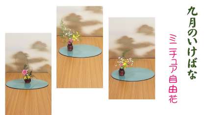 ミニチュア自由花とは,A4サイズの紙を半分に折って出来る空間に収まるサイズのいけばなです。