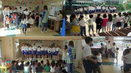 楽しい活動の時間が終わったら,お別れです。2階からは,小さなクラスの園児さん達が小さな手を一生懸命振ってくれました。