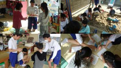 部屋の中では,「はじめましてよろしくね♪あくしゅをしてよろしくね♪」とリズムにのって楽しくご挨拶をし,ぎゅーっとだっこもしました。中学生からは「かわいい!」と声があがっていました。そのあと,中学校から持って行ったお手玉,けん玉,だるま落とし,折り紙,コマ回し,美術の授業で作ったパズルなどで遊びました。外では,砂遊びで大きなお山を作ったり,鬼ごっこをしたりして,アクティブに過ごしました。