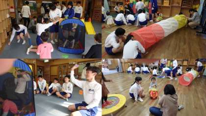 小さな滑り台を何度も滑る子,ボールを投げ入れる遊びでは中に入って一生懸命ボールを外に投げ出す子(そのボールを中学生がどんどん入れていました)など,同じ遊びを飽きずに繰り返し繰り返し,夢中になってやっていました。