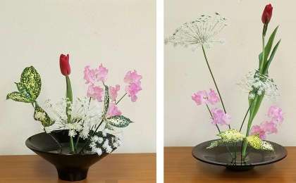 そしていけばな。今回の花材は,チューリップ,スイートピー,レースフラワー,ゴッドと,大変春らしいお花です。みんな,思いのままに生けていました。