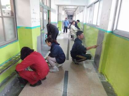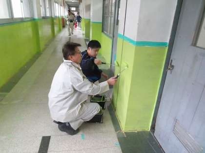 今日は,管理用務員さんに指導を受けながら,3年生の教職員が中心となりペンキ塗りを行いました。今回塗っている場所は,4月から新入生のフロアーになるところです。色はフレッシュグリーンで,新入生にとってなじみやすいように,小学校と統一した色にしています。