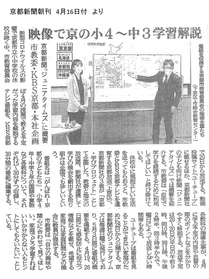 本日,最初のお知らせは,本日の京都新聞朝刊(4月16日付)に掲載されていますが,京都市教育委員会がKBS京都・京都新聞社との合同企画で、4月に予定していた学習内容をテレビやユーチューブ等で配信することとなりました。小学4年から中学3年の各教科の内容で、1本15〜30分の構成で約60本あり、各教科の学習内容に加え、英語の歌、ストレッチ運動、手作りマスクの方法等も紹介する予定です。