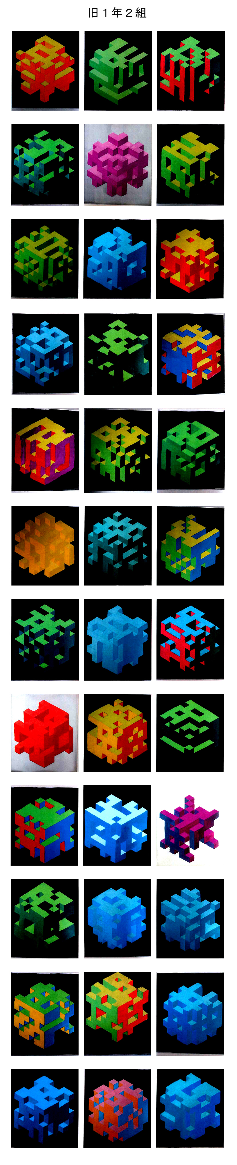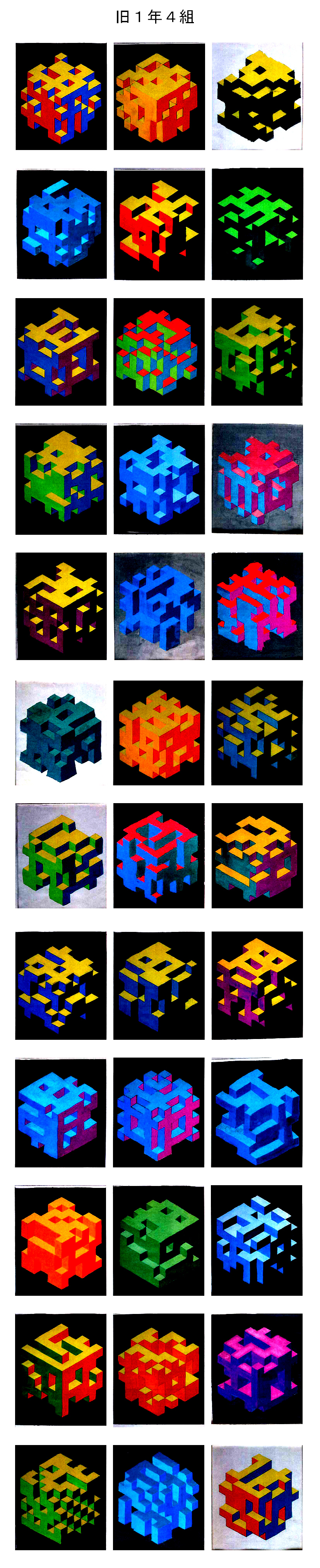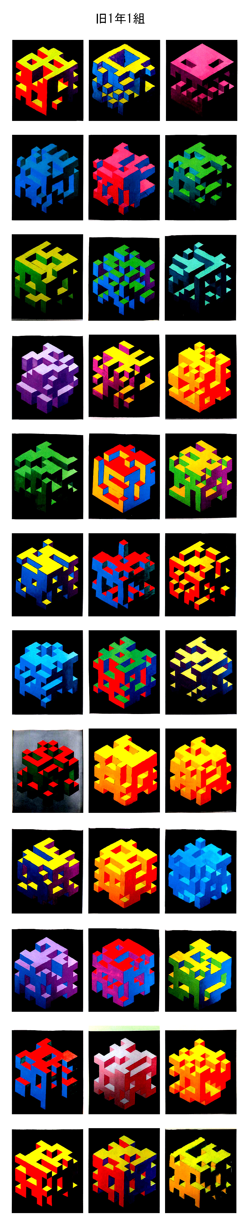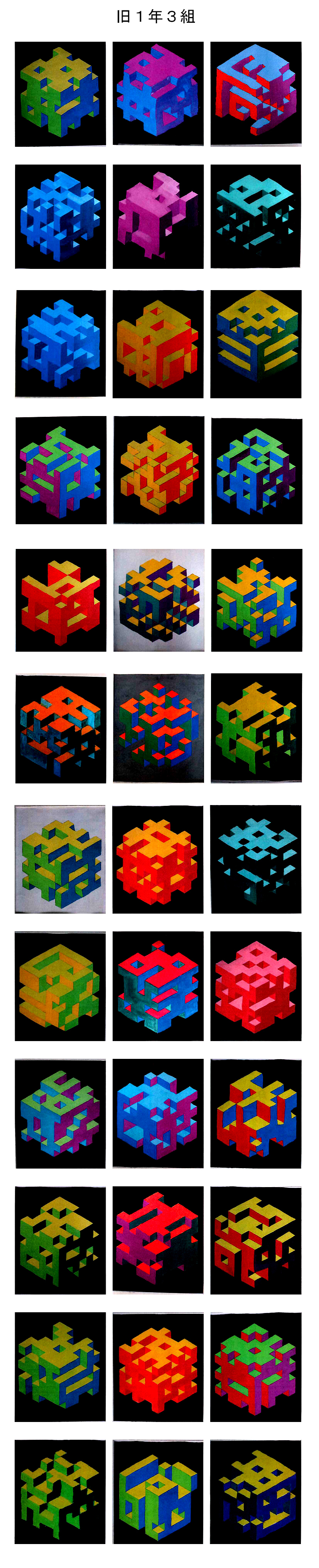 学んでもらった色彩の知識を確認する意味で、立方体を自由にへこませたように作図した下絵に、立体的に見えるように上面左面右面の各色面の明度が順に低くなるように3色を選び、その3色が同一色相、類似色相、対照色相の各配色のどれかになるように配色し、また、背景色は無彩色で、ポスターカラーで彩色するという課題でした。この制約の中でも色々なバリエーションの作品ができあがり、並べるととても美しい展示コーナーになりました。新2年生は自分の作品を思い出して探してみてください。(ただし未提出分、未完成分は掲載していません。)作品は授業再開後返却します。返却後はホームセンターなどで額を買ってきて入れて部屋に飾ると、とてもいいインテリアになるので是非そうしてください。