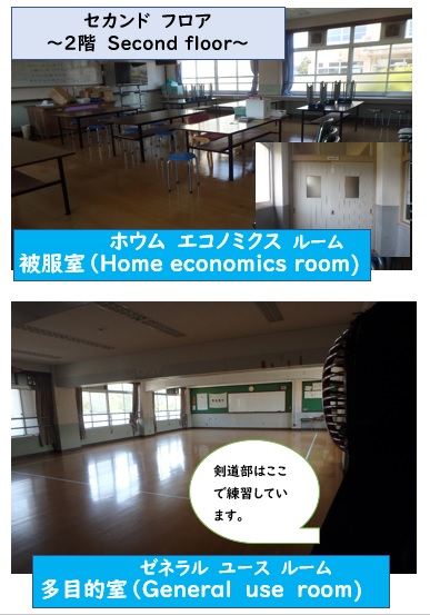 被服室は家庭科の授業で使います。家庭科は英語で,home economicsです。多目的室に入ると右の人物(?)にギョッとするのですが,合唱コンクールの練習などにも使用します。