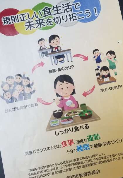 今日の学活で,京都市教育委員会が作成した「規則正しい食生活で未来を切り拓こう!」というリーフレットを使った学活が行われました。このリーフレットは,昨年10月に約2000名を対象に実施された食生活実態調査の集計結果をまとめて作られたものです。