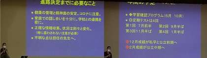 そのあと,「令和3年度京都府公立高等学校入学者選抜概要及び前期選抜等実施要項」の冊子を用い,前期選抜について詳しく説明がありました。中期選抜,定時制についても触れられ,30分ほどかけて,進路についての話となりました。
