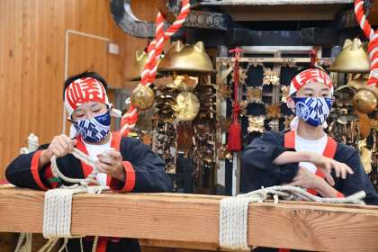 組み手の仕事は,この御輿本体とみんなが担ぐ長柄(ながえ)を紐でしばり,御輿本体の飾りや鈴を飾り紐(紅白)で結び付けて完成させます。