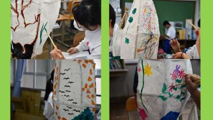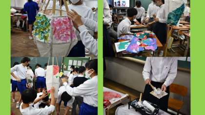 3年生は3度目の竹行灯制作となることから,手慣れたものです。白い和紙を貼り付けた後,考えていたデザインを先日色染めをした和紙をちぎったり貼り付けたり,ハサミやカッターを使って模様や形にして貼り付けたり,絵の具を使って絵を描いたりと素晴らしい作品を作ってくれています。
