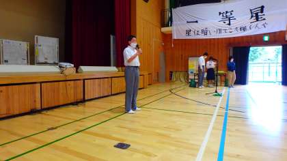 下の写真は,1枚目に体育館に集まった様子,2枚目は司会2人と文化委員学年代表,3枚目は文化委員学年代表のあいさつの様子です。