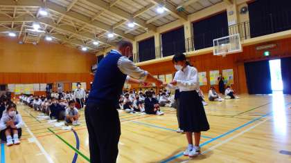 最優秀賞,優秀賞に選ばれた2人を学年主任より表彰してもらい,工夫点などをインタビュー形式で発表してもらいました。