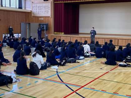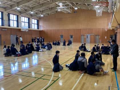 4限,体育館に公立中期選抜学力検査にのぞむ生徒たちが集まって,激励会と受検校ごとの諸注意を行いました。